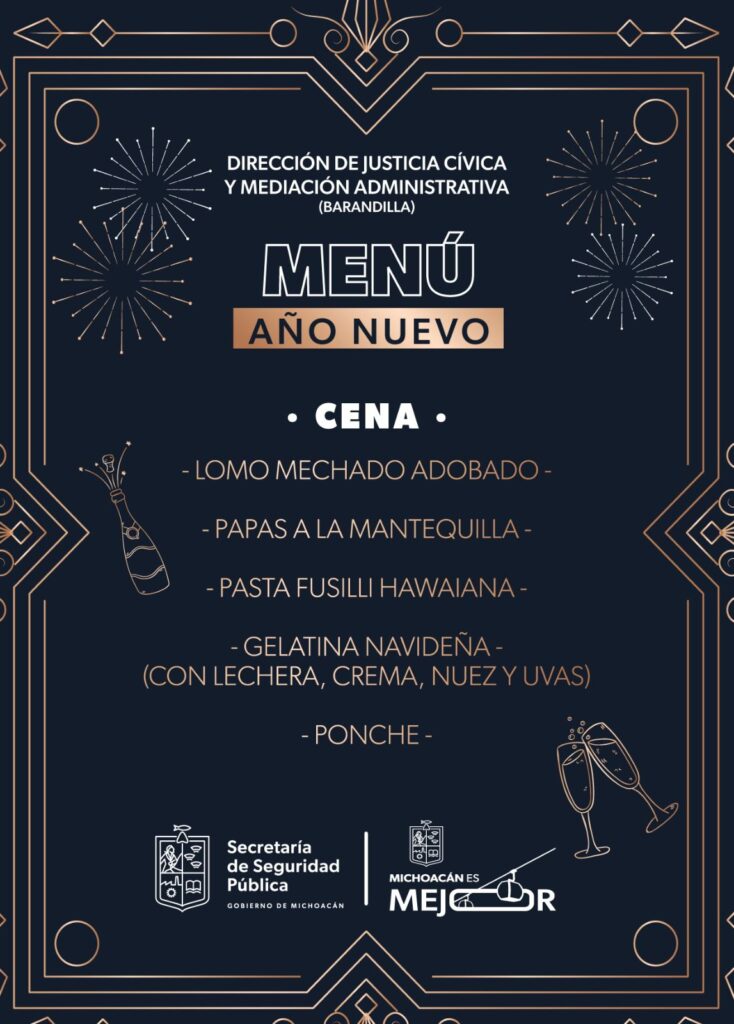 Para las personas infractoras que ingresen a barandilla por cometer faltas administrativas durante la noche de Año Nuevo, la Secretaría de Seguridad Pública (SSP) ofrecerá como cena lomo mechado, ponche de frutas y postre.