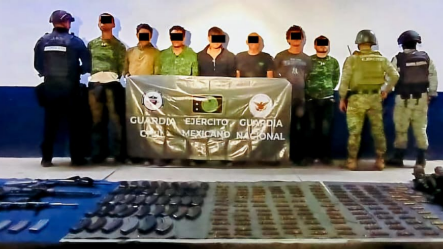 A los indiciados les fueron asegurados 7 rifles de asalto, 49 cargadores para arma larga, 1,340 cartuchos útiles, y 7 chalecos porta placas.