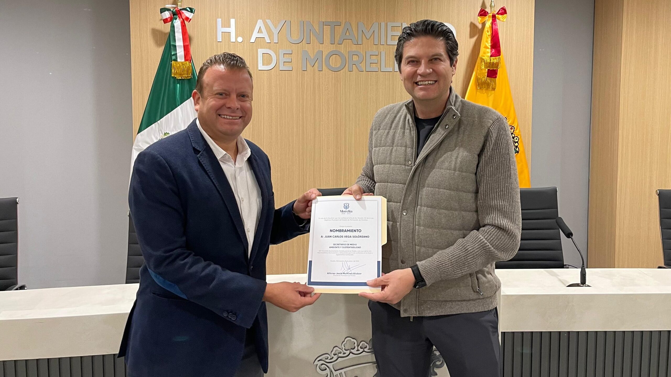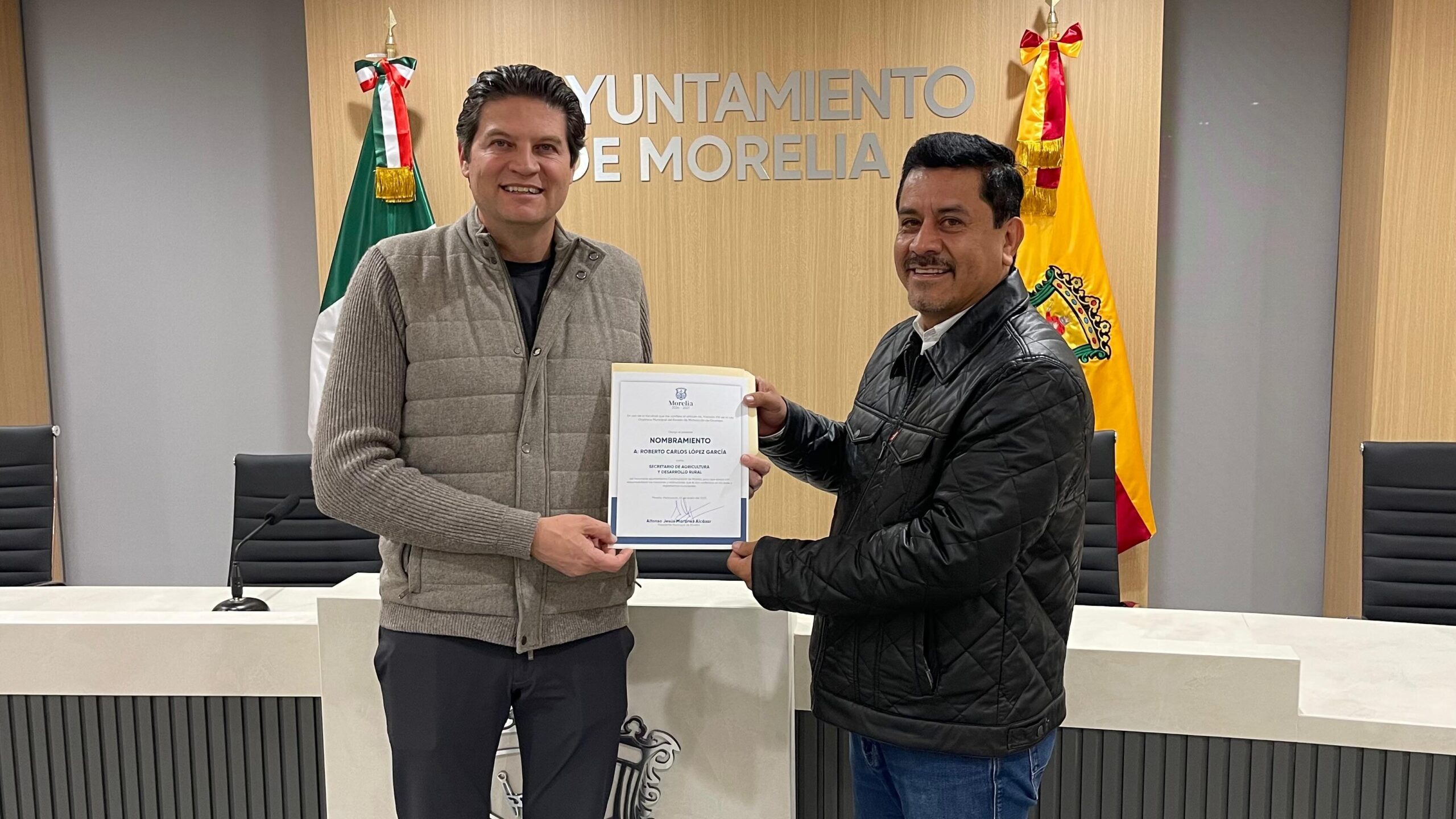 Con un llamado a mantener una política de puertas abiertas y cercanía con las y los morelianos, el Presidente Municipal, Alfonso Martínez Alcázar, designó a Roberto Carlos López García como nuevo Secretario de Desarrollo Rural y a Juan Carlos Vega Solórzano, como Secretario de Medio Ambiente y Sustentabilidad.