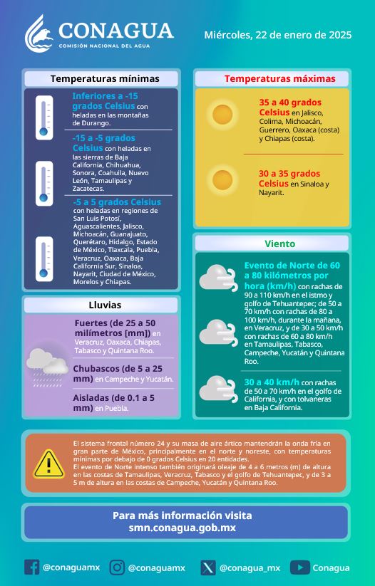 Además, CONAGUA, advirtió que para este miércoles se mantedrá una masa de aire ártico asociada a dicho frente climático con rachas de viento de 90 a 110 km/h.