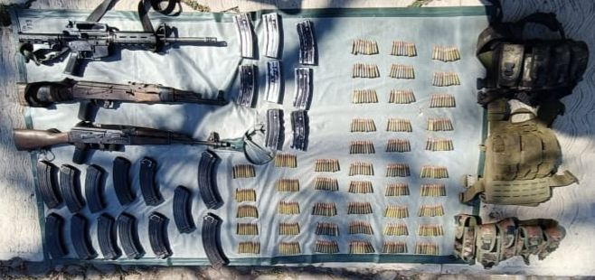 En el lugar decomisaron un artefacto explosivo, dos armas de fuego calibre 7.62X39 y otra 5.56 milímetros, así como 450 cartuchos útiles y 21 cargadores; lo anterior será puesto a disposición de la autoridad competente.