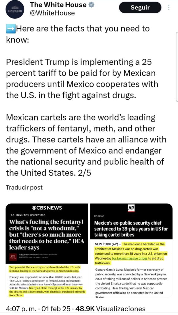 Y precisa: «Estos son los hechos que necesita saber: El presidente Trump está implementando un arancel del 25 por ciento que pagarán los productores mexicanos hasta que México coopere con Estados Unidos en la lucha contra las drogas. Los cárteles mexicanos son los principales traficantes de fentanilo, metanfetamina y otras drogas del mundo».
