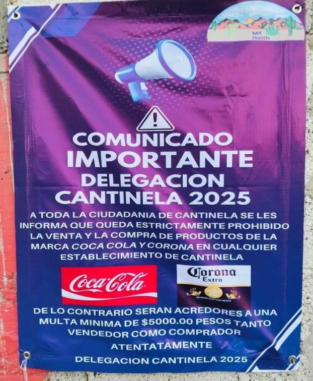 “A toda la ciudadanía de Cantinela se le informa que queda estrictamente prohibida la venta y compra de productos de la marca Coca-Cola y Corona en cualquier establecimiento”, señala el mensaje de prohibición firmado por la Delegación Cantinela 2025.