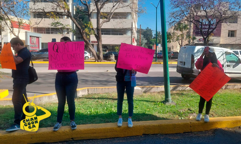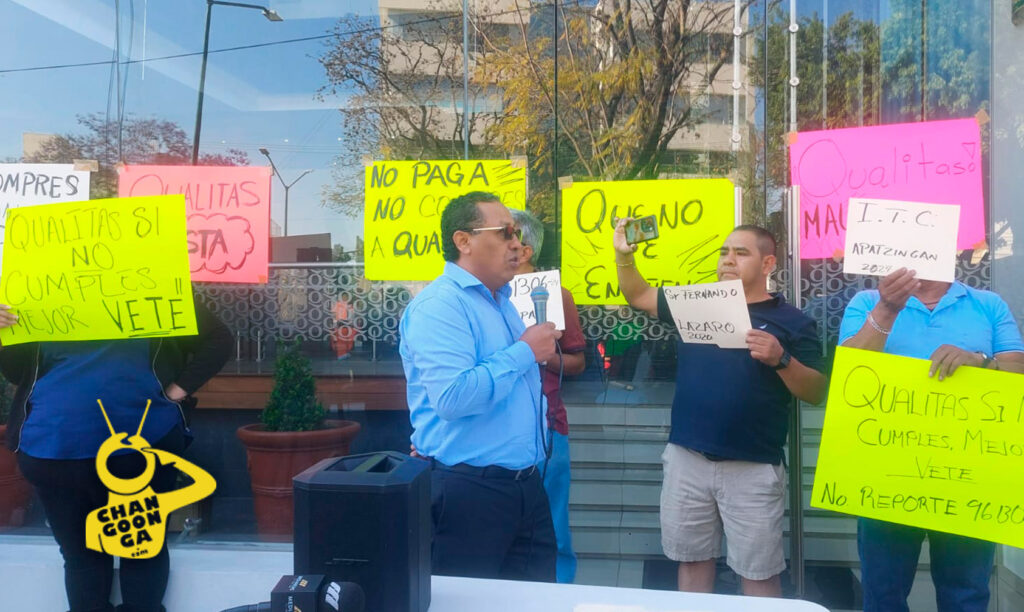 Clientes de la aseguradora Quálitas se manifestaron este miércoles tomando de manera simbólica las oficinas de esta empresa en av. Camelinas, Morelia.