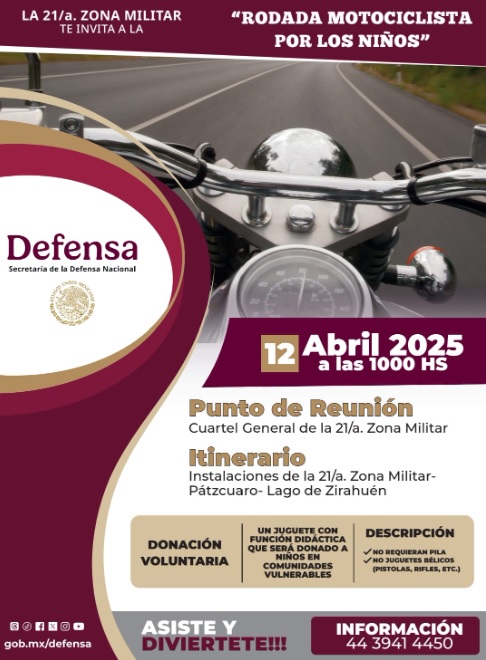 Este evento se llevará a cabo a las 10 de la mañana el día 12 de Abril del 2025, la cual tendrá el punto de encuentro en las instalaciones de la 21 Zona Militar de Morelia teniendo un itinerario a Pátzcuaro y hasta el Lago de Zirahuén.