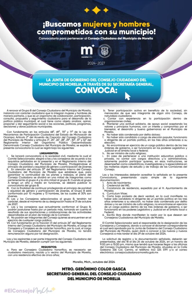 Tienes del 18 de octubre al 24 del mismo mes para postularte, ya sea de manera presencial en las instalaciones del Consejo Ciudadano (Galeana #336 Col. Centro) o en el correo consejociudadano@morelia.gob.mx
