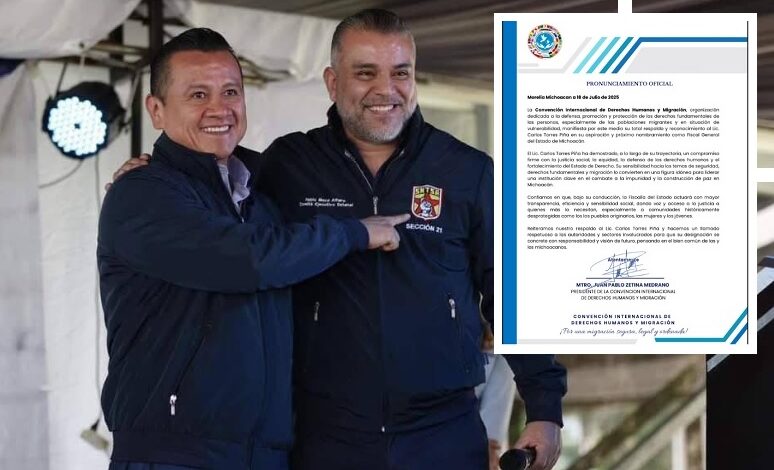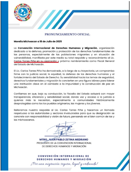 En el marco del proceso de selección para la titularidad de la Fiscalía General del Estado de Michoacán, la Convención Internacional de Derechos Humanos y Migración manifestó públicamente su respaldo al aspirante Carlos Torres Piña, destacando su trayectoria, sensibilidad social y compromiso con la justicia.
