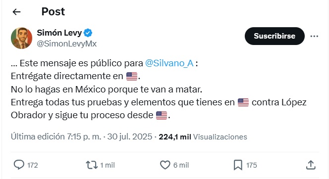 “Este mensaje es público para Silvano Aureoles”, expresó via X Twitter el polémico Simón Levy, quien se presenta como emprendedor y empresario aunque sus críticos lo consideran un loco sensacionalista, tras haber sido un ferviente lopezobradorista para luego convertirse en un severo crítico de Andrés Manuel López Obrador.