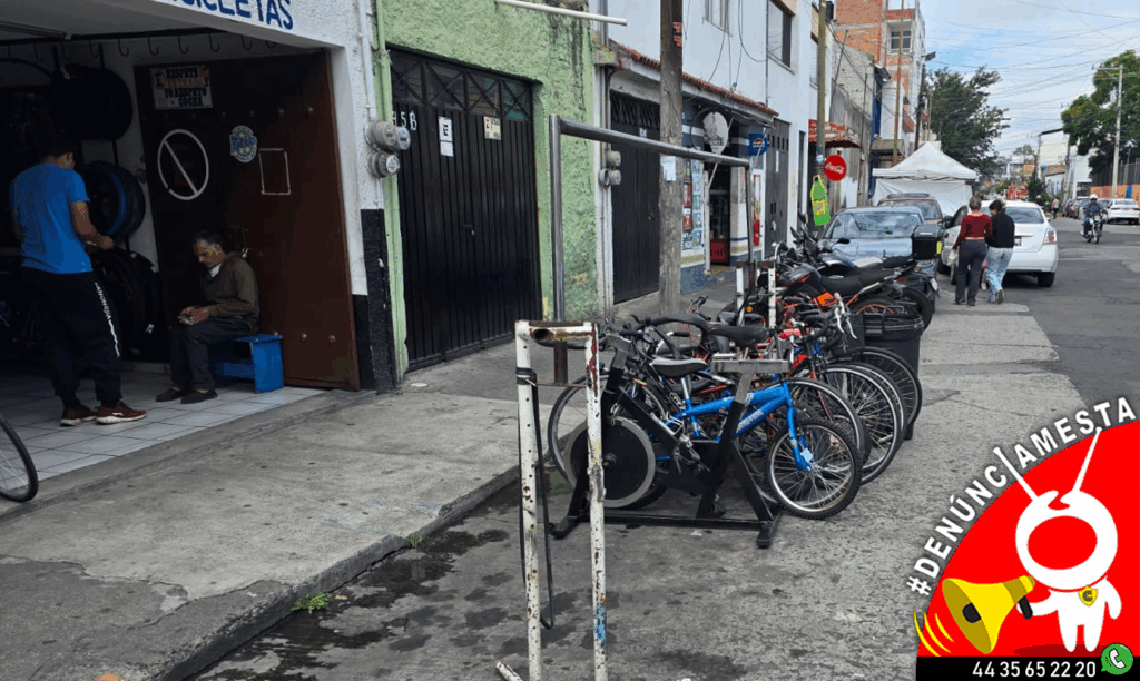 «Taller de bicicletas «el rapido» en la calle Zamora #45A, invade vía pública con fierros, botes, bicicletas, motos, etc, además de ruido excesivo a todas horas y manejo de solventes en área NO adecuada, rodeado de casa habitación y escuela primaria»