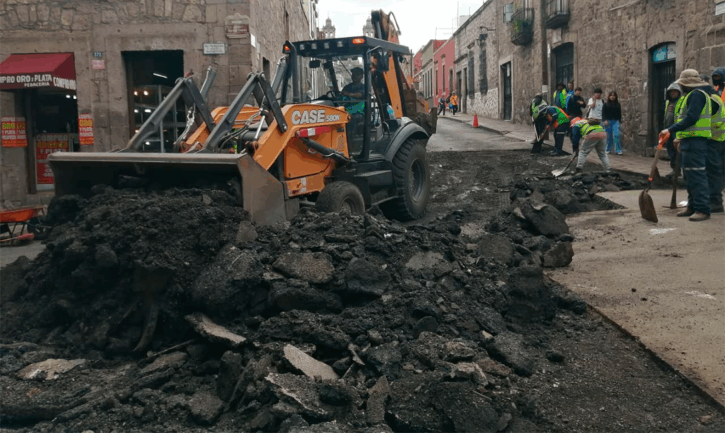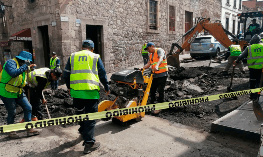 El Gobierno de Morelia, a través de la Secretaría de Obras Públicas, realiza este jueves trabajos de reparación de baches en la intersección de la calle Emiliano Zapata con la Avenida Morelos Norte, en el Centro Histórico de la ciudad, con el objetivo de mejorar la superficie de rodamiento y garantizar una circulación más segura.