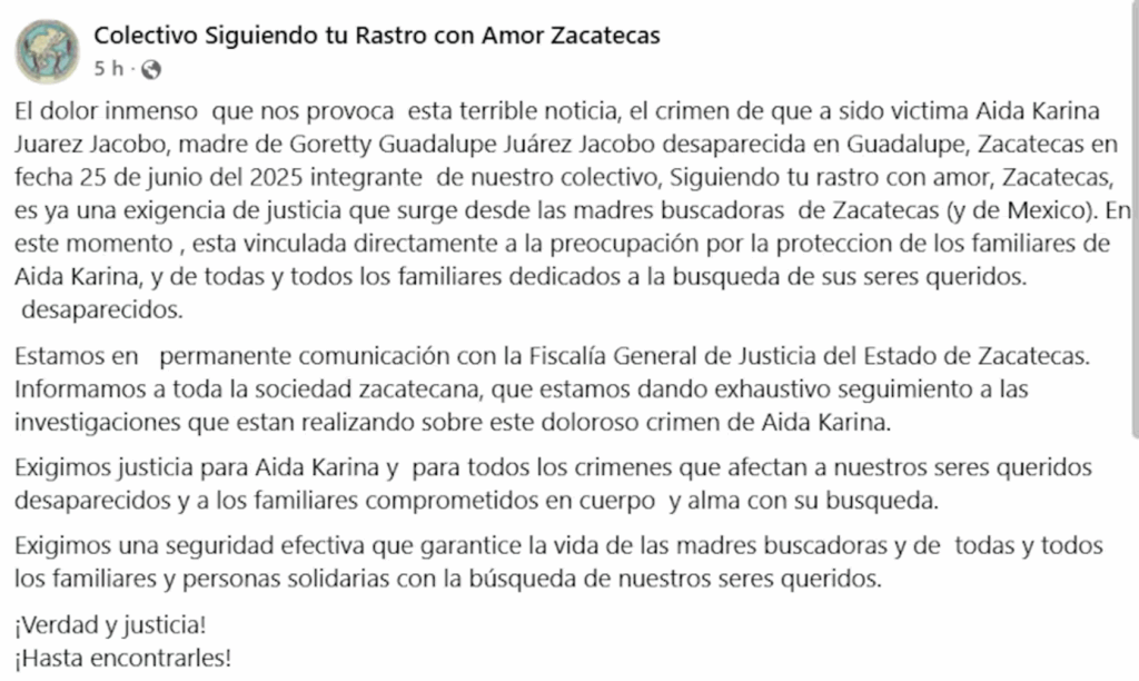 El asesinato de Karina ha generado indignación entre colectivos de búsqueda, quienes subrayaron que su lucha no termina y que seguirán buscando a Goretty Guadalupe y a todas las personas desaparecidas en la región.