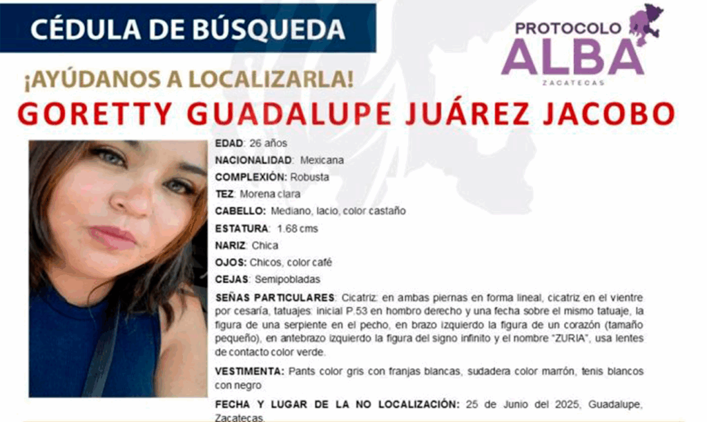 La Fiscalía General de Justicia de Zacatecas que confirmó que el cuerpo localizado en San Luis Potosí corresponde a Ada Karina Juárez Jacobo, madre buscadora que desde junio buscaba a su hija desaparecida en Guadalupe, Zacatecas. Su familia la reconoció oficialmente.