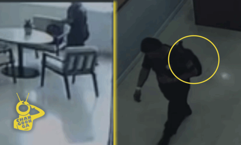 Las cámaras de videovigilancia del municipio registraron el momento exacto en que un hombre uniformado ingresa al recinto, toma una mochila que se encontraba en una silla blanca y abandona el lugar con total naturalidad.