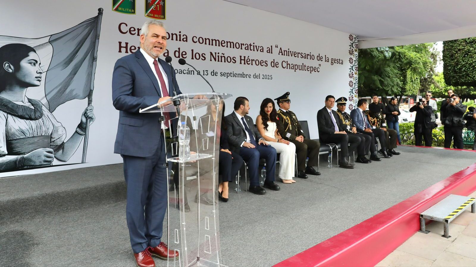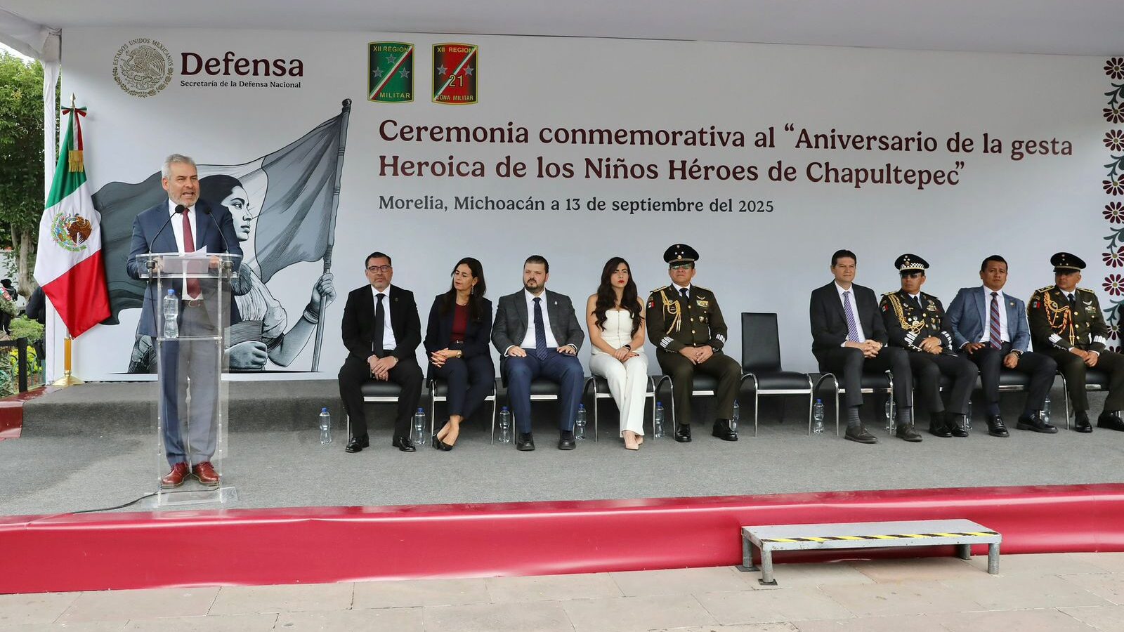 El gobernador Alfredo Ramírez Bedolla hizo un llamado a seguir el ejemplo de valentía y patriotismo de los Niños Héroes de Chapultepec para defender la soberanía de México con firmeza y enfrentar cualquier amenaza con ideas, capacidades, diplomacia y diálogo.