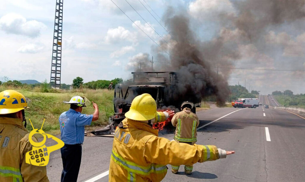 Efraín S., tripulaba un camión tipo Torton de color blanco con verde y placas de circulación NG-1201-C, cargado con limones, cuando a la altura del negocio «Quesos el Rojo», observó que del área del motor salía hubo y fuego, por lo que se orilló y se puso a salvo.