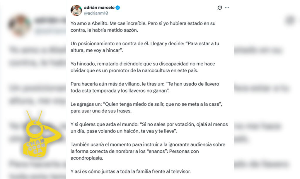 En su cuenta de X imaginó lo que le diría a Abelito si se enfrentaran y soltó frases como “Para estar a tu altura, me voy a hincar” y “Te han usado de llavero toda esta temporada y los llaveros no ganan”, además intentó lavarse las manos diciendo que era solo “sazón” al conflicto, pero muchos lo vieron como pura burla.