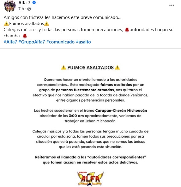 Luego de cumplir con un compromiso laboral al realizar un concierto en la comunidad purépecha de Ichán, en la Cañada de los 11 Pueblos, la agrupación músical ALFA 7 denunció haber sufrido un asalto con violencia la madrugada de este martes 7 de octubre.