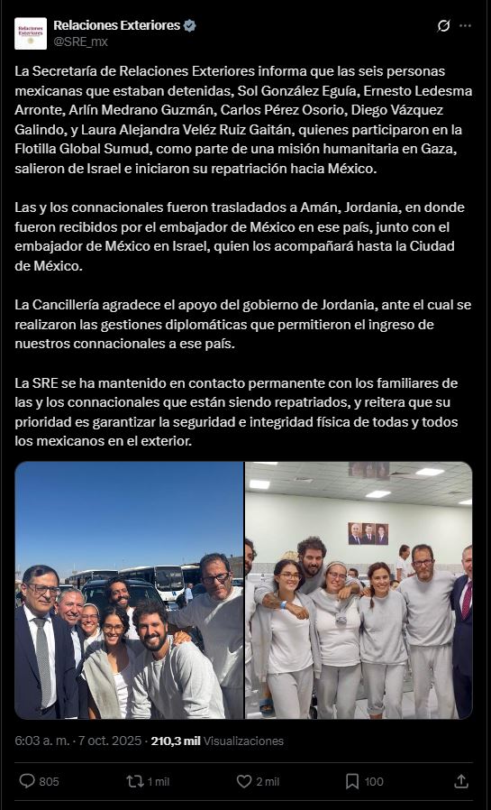 Las seis personas mexicanas detenidas en Israel por participar en la misión humanitaria Flotilla Global Sumud fueron liberadas y ya iniciaron su repatriación a México, informó la Secretaría de Relaciones Exteriores (SRE) a través de un comunicado publicado en su cuenta oficial de X.
