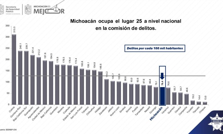 Michoacán se ubica en el lugar número 25 a nivel nacional en el registro de la comisión de delitos durante el presente año. Este avance es resultado de la estrategia interinstitucional implementada por el Gobierno del Estado a través de la Secretaría de Seguridad Pública (SSP) para garantizar el orden y el bienestar social.