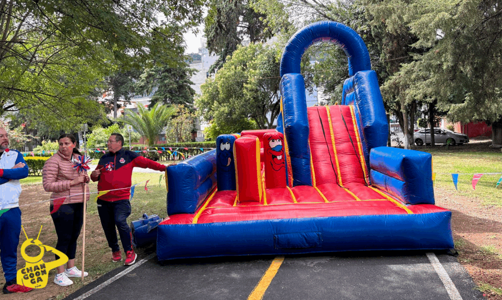 La carrera consistió en recorrer una distancia de 100 metros en una pista con forma de circuito, llena de obstáculos como conos, cuerdas para saltar y un gran inflable dividido en dos secciones: una pirámide para escalar y otra con barras y pilares inflables que las botargas tenían que esquivar y empujar para avanzar. Fue justo en esa parte donde más se desató la batalla: botargas que perdían sus tenis, cabezas que salían volando, empujones, caídas y risas por montones.