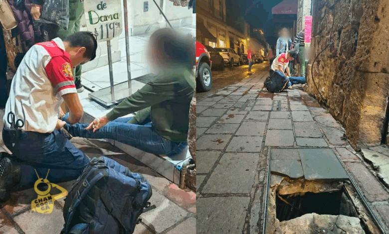 Una transeúnte quedó herida tras caer a un registro luego de que la tapa de laja de cantera se rompió, accidente ocurrido en una de las banquetas del Centro Regulador Histórico de Morelia.