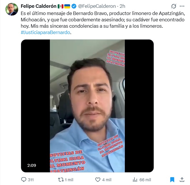“Es el último mensaje de Bernardo Bravo, productor limonero de Apatzingán, Michoacán, y que fue cobardemente asesinado; su cadáver fue encontrado hoy. Mis más sinceras condolencias a su familia y a los limoneros. #JusticiaparaBernardo”.