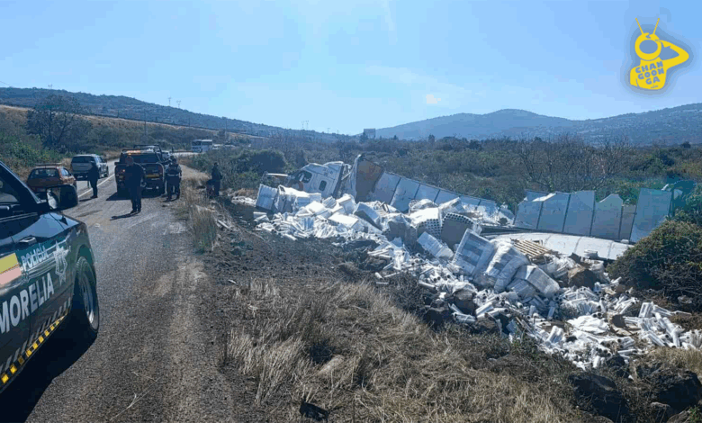 Un tráiler del Grupo Ortiz (GO), el cual transportaba rollos de plástico, se accidentó y su caja terminó destrozada en un desnivel a la orilla de la carretera Morelia-Quiroga, informaron fuentes policiales, las cuales agregaron que el chofer resultó levemente lastimado.