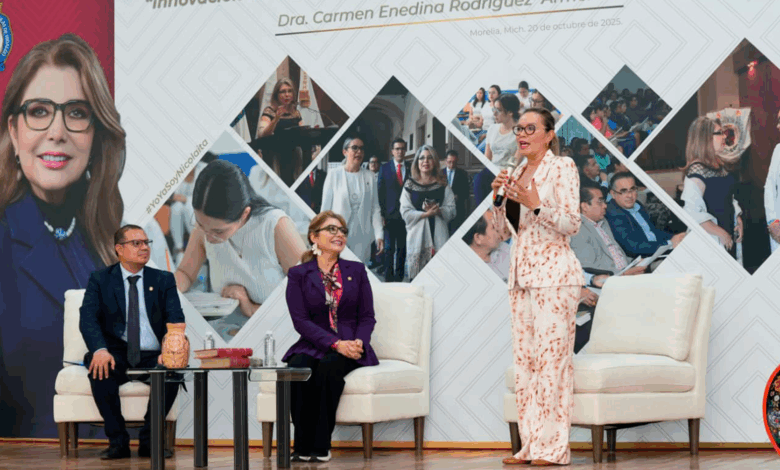 Lo anterior, al brindar la conferencia magistral “Innovación en microcredenciales y solidez académica en Ceneval”, en donde estuvo acompañada por la rectora de la Universidad Michoacana de San Nicolás de Hidalgo (UMSNH), Yarabí Ávila González.
