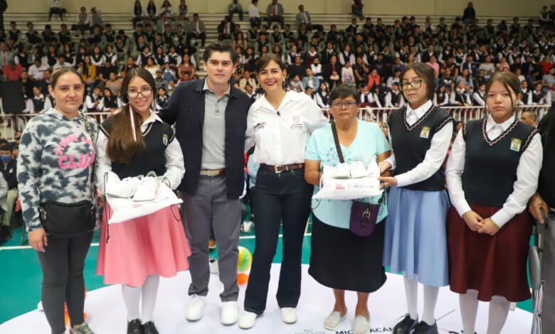 La secretaria de Educación, Gabriela Molina, destacó la inversión de 35 millones de pesos destinada principalmente a la obra educativa de nivel medio superior en Zitácuaro, en el marco de la entrega de 8 mil 800 pares de tenis del programa “Jalo a Estudiar, Jalo por la Paz” para 43 escuelas, acción que refleja la voluntad de mejorar las condiciones de estudio de miles de estudiantes.