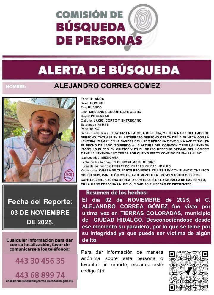 Pobladores de Zinapécuaro convocan a marcha pacífica para la localización del exalcalde, Alejandro Correa Gómez, desaparecido desde el domingo 2 de noviembre.