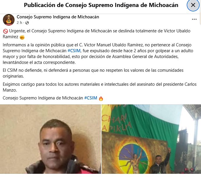 En primera instancia el Consejo Supremo Indígena de Michoacán (CSIM) emitió un mensaje para deslindarse totalmente del padre del asesino, que lleva los mismos nombres,  Victor Manuel Ubaldo Ramírez, informando a la opinión pública que “no pertenece al Consejo Supremo Indígena de Michoacán CSIM, fue expulsado desde hace 2 años por golpear a un adulto mayor y por falta de honorabilidad, esto por decisión de Asamblea General de Autoridades, levantándose el acta correspondiente”.