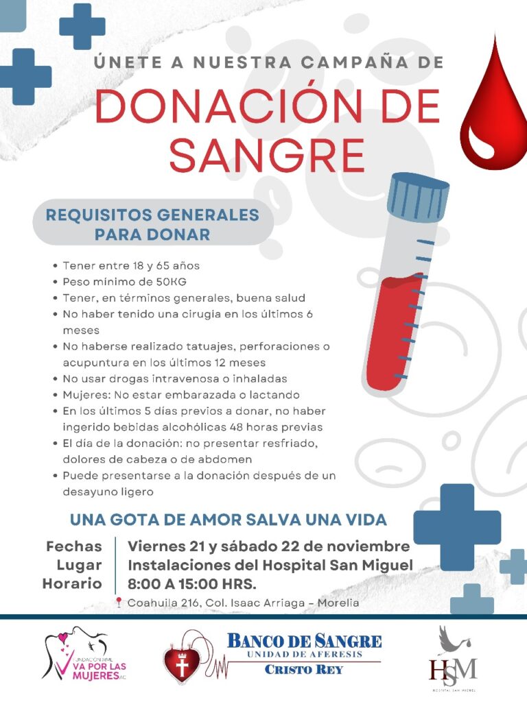 Anuncian la campaña para invitar a los morelianos a donar el líquido vital, al Banco de Sangre Cristo Rey de Morelia, los próximos 21 y 22 de noviembre dentro de las instalaciones del hospital San Miguel, ubicado en la calle Coahuila 216, colonia Isaac Arriaga.