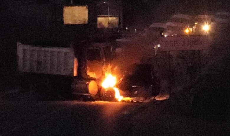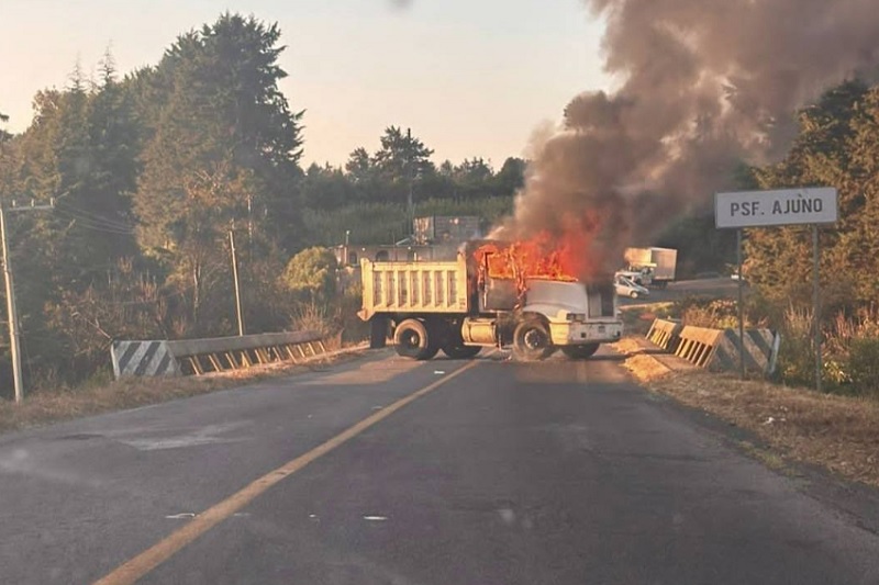 Trascendió que sobre la carretera Pátzcuaro-Uruapan, a la altura de la población de Ajuno, los delincuentes atravesaron un camión tipo volteo y lo quemaron.