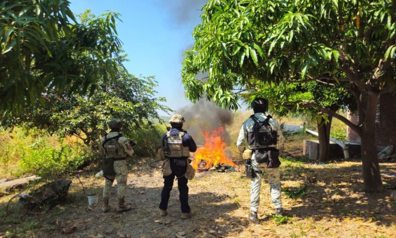 Elementos de las secretarías de Seguridad Pública (SSP) y de la Defensa Nacional (Defensa), localizaron e incineraron cuatro campamentos clandestinos presuntamente utilizados por grupos delictivos en el municipio de Buenavista.