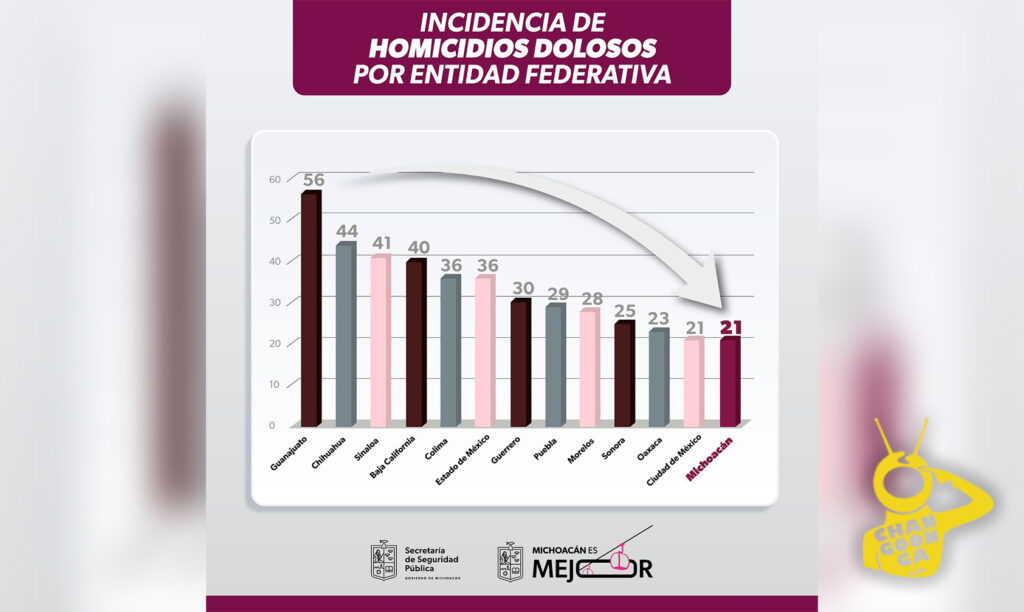 De acuerdo con el reporte nacional de este miércoles, Michoacán salió de los primeros 10 estados con más casos de homicidio doloso, colocándose en la posición número 13.