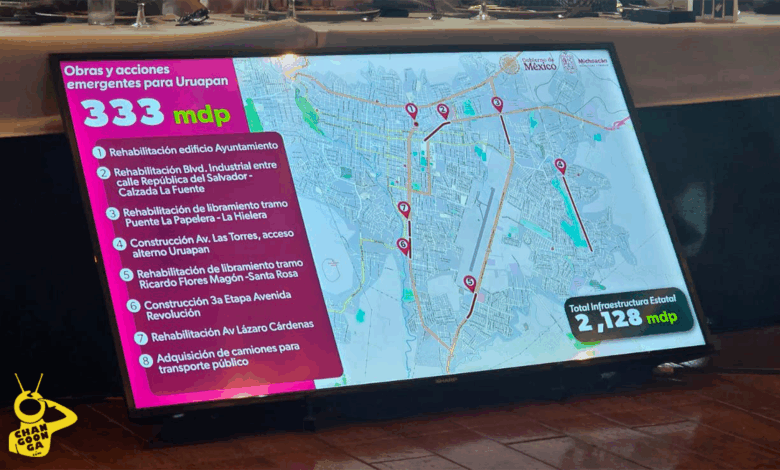 Durante la exposición del Plan Michoacán, el gobierno estatal anunció 333 millones de pesos para obras emergentes en Uruapan y contempló un total de 2 mil 128 millones de pesos en infraestructura.