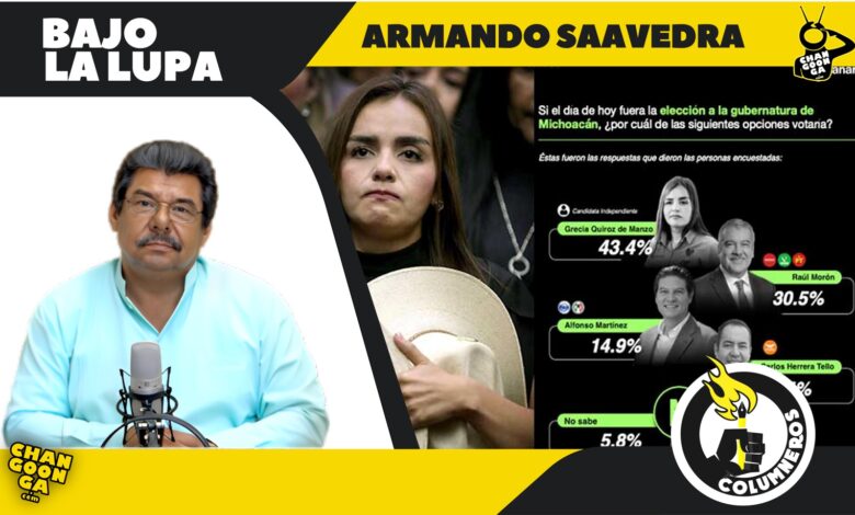 El sondeo de Poligrama coloca a GRECIA QUIROZ DE MANZO en un escenario inédito: con 43.4 % de las preferencias electorales se ubica por encima de RAÚL MORÓN (30.5 %), ALFONSO MARTÍNEZ (14.9 %) y CARLOS HERRERA TELLO (5.4 %). Una viuda sin afiliación partidista, recién nombrada alcaldesa de Uruapan, aparece como puntera en la carrera por la gubernatura de Michoacán. El dato es contundente, pero exige matices.