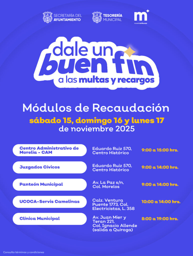 Con el objetivo de apoyar la economía de las familias y empresas morelianas, el gobierno del presidente municipal, Alfonso Martínez Alcázar, invita a la ciudadanía a aprovechar el puente oficial del 15 al 17 de noviembre para ponerse al día en sus contribuciones, con los descuentos que ofrece en su programa «Dale un buen fin a las multas y recargos».
