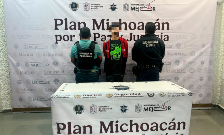 La Guardia Civil a través del Agrupamiento Especializado en Búsqueda de Personas Desaparecidas realizó la detención de un hombre de 28 años, durante operativos enmarcados en el Plan Michoacán por la Paz y la Justicia.