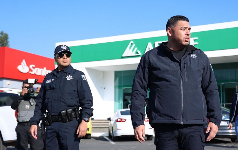 Los elementos policiales realizan tareas principalmente de vigilancia y proximidad social para dar certeza a las personas que acudan a instituciones financieras a realizar retiros o depósitos en esta temporada decembrina, donde anualmente incrementa la afluencia, principalmente por el pago del aguinaldo.