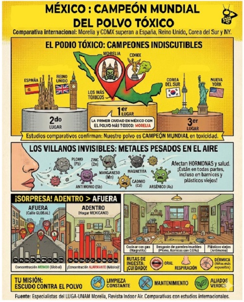 De acuerdo con un estudio desarrollado por especialistas de la Universidad Nacional Autónoma de México, el polvo presente en hogares de ciudades mexicanas, entre ellas Morelia y la Ciudad de México, resulta más tóxico que el registrado en países como Reino Unido o España. La investigación fue realizada por el Laboratorio Universitario de Geofísica Ambiental, con la participación de investigadores del Centro de Investigaciones en Geografía Ambiental y del Instituto de Geofísica, Unidad Morelia.