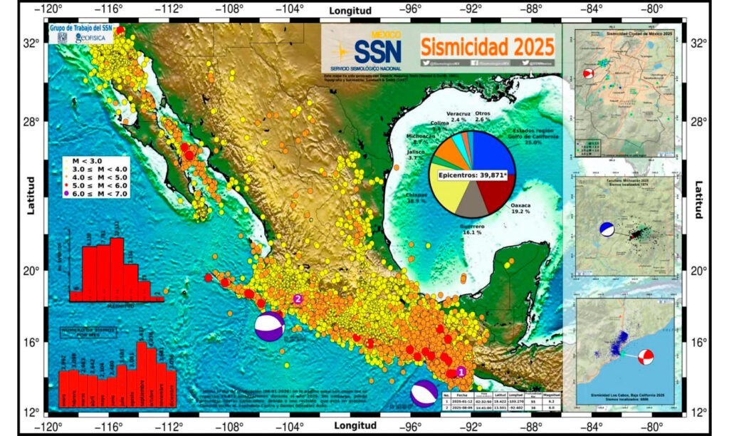 De acuerdo con el reporte anual 2025 de sismicidad en México del Servicio Sismológico Nacional (SSN), en el país se contabilizaron un total de 39 mil 871 epicentros durante el año pasado.
