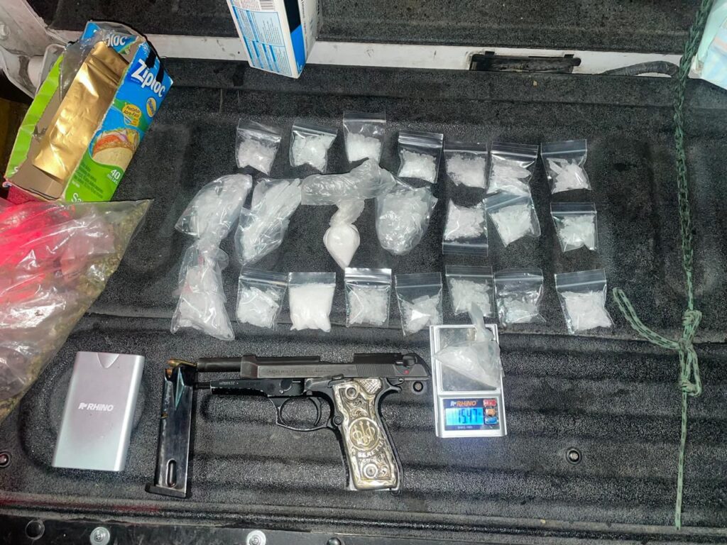 Al realizarles una revisión, los oficiales les encontraron entre sus pertenencias seis bolsas plásticas con la metanfetamina, mientras que en el vehículo localizaron otras 11 bolsas con la misma droga, además de una pistola, calibre .9 milímetros.