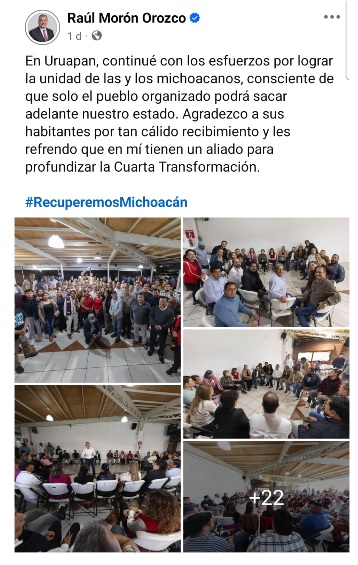 “En Uruapan, continué con los esfuerzos por lograr la unidad de las y los michoacanos, consciente de que solo el pueblo organizado podrá sacar adelante nuestro estado. Agradezco a sus habitantes por tan cálido recibimiento y les refrendo que en mí tienen un aliado para profundizar la Cuarta Transformación” manifestó Morón Orozco en sus redes sociales.