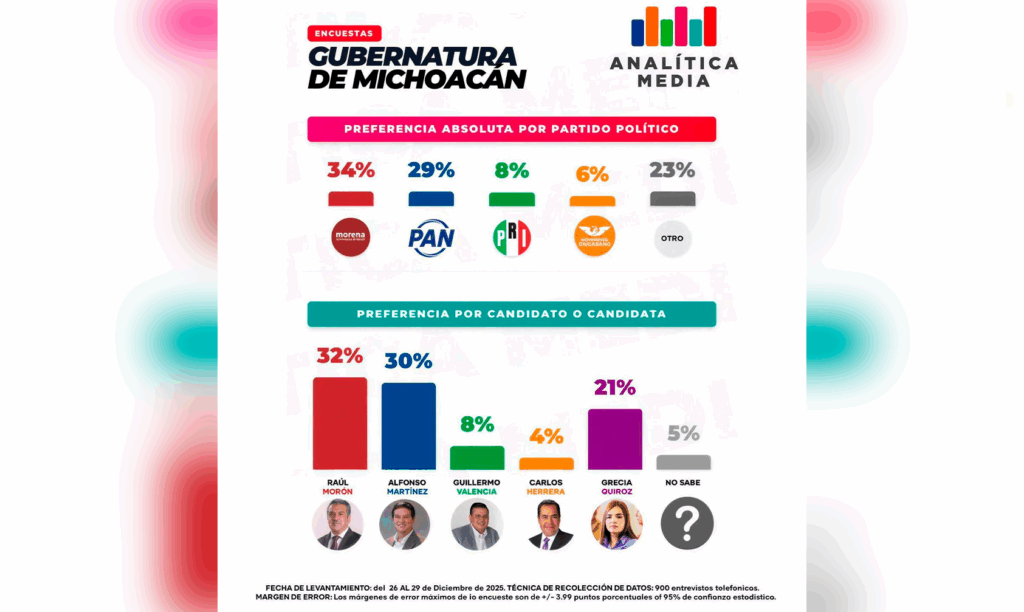 Rumbo a la elección por la gubernatura de Michoacán en 2027, distintas encuestas difundidas en los últimos meses muestran que Raúl Morón Orozco y Fabiola Alanís Sámano se alternan el primer lugar en la contienda electoral, consolidándose como los perfiles mejor posicionados de Morena hasta el momento.