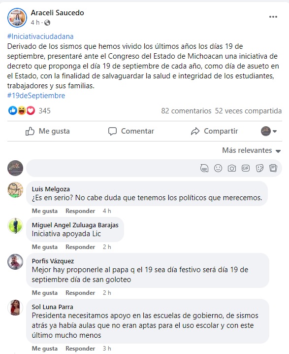 “Derivado de los sismos que hemos vivido los últimos años los días 19 de septiembre, presentaré ante el Congreso del Estado de Michoacán una iniciativa de decreto que proponga el día 19 de septiembre de cada año, como día de asueto en el Estado, con la finalidad de salvaguardar la salud e integridad de los estudiantes, trabajadores y sus familias”, compartió la munícipe Araceli Saucedo en su perfil de Facebook, generando todo tipo de comentarios.