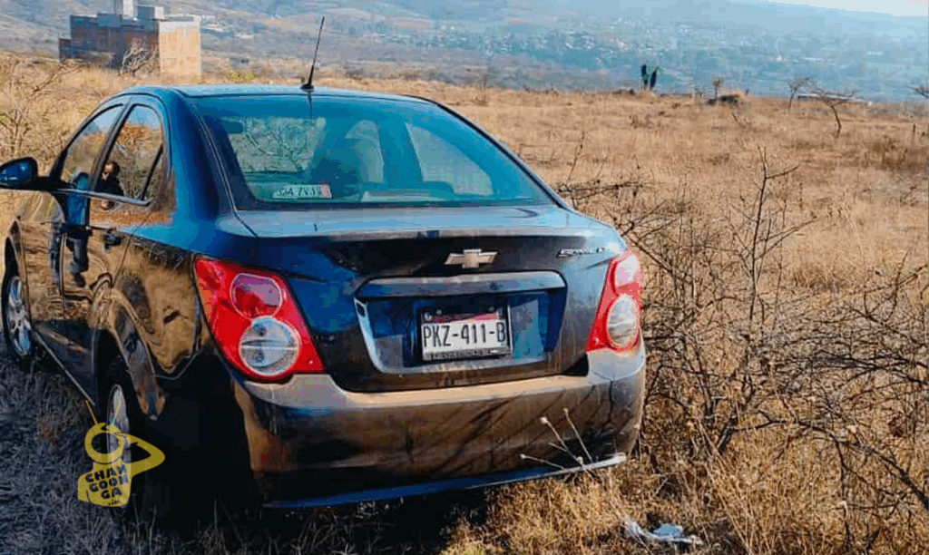 A una distancia aproximada de 50 metros fue encontrado un vehículo abandonado, marca Chevrolet Sonic, color negro, con placas PKZ-411-B, el cual, según fuentes policiales, podría pertenecer a la víctima.