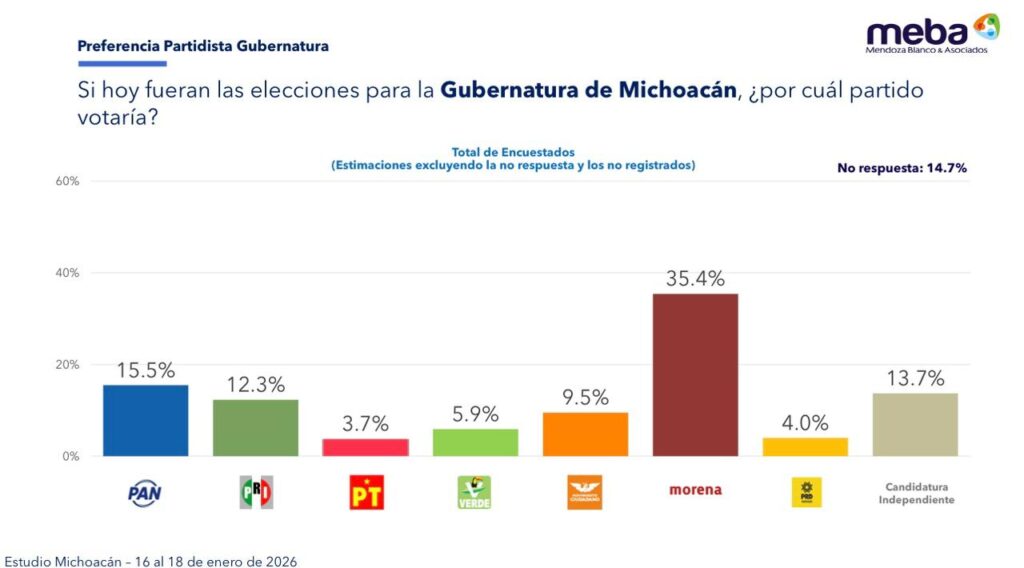 La encuesta MEBA se levantó del 16 al 18 de enero de 2026, con una muestra de 1,000 entrevistas efectivas a ciudadanos con credencial de elector en el estado de Michoacán. El estudio cuenta con un margen de error de ±3.5% y un nivel de confianza del 95%. La recolección fue cara a cara en domicilio, utilizando boleta y urna simulada, con un diseño muestral estratificado y ponderación conforme a criterios del INE.