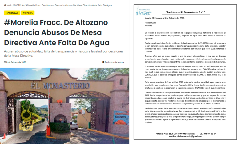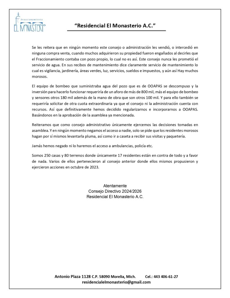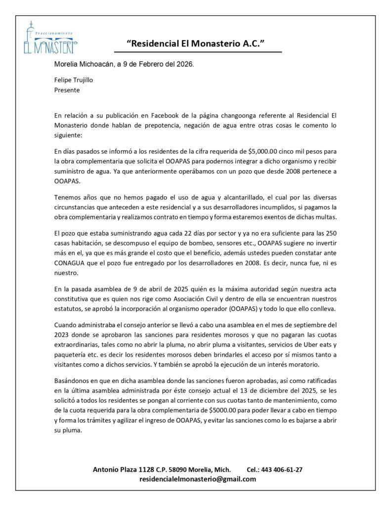 Luego de la denuncia pública realizada por habitantes del Fraccionamiento El Monasterio, en la que acusaron presuntas irregularidades graves por parte de la Mesa Directiva, el Consejo Directivo 2024–2026 de Residencial El Monasterio A.C. hizo llegar a Changoonga.com su derecho de réplica, en el que expone su postura y versión de los hechos.