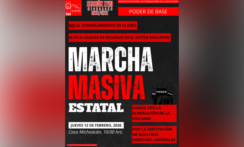 Integrantes de la Sección XVIII Michoacán del SNTE/CNTE, Poder de Base, convocaron a una marcha masiva estatal programada para el próximo jueves 12 de febrero de 2026, con el objetivo de manifestar diversas demandas del sector educativo.